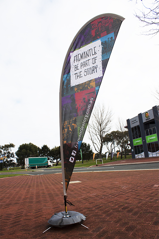 Our Tear Drop Banners will make you cry tears of joy! These are elegant, eye catching and hugely mobile forms of advertising indoors or outdoors. Made from quality aluminum hardware and thick polyester, these banners can be used outside on a daily basis. The polyester material has your design printed on it using a die sublimation printing method that injects the ink deep into the material for vivid, durable colours.